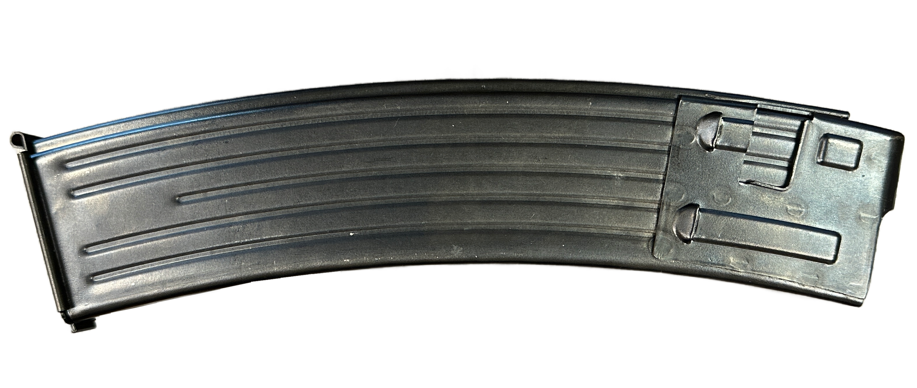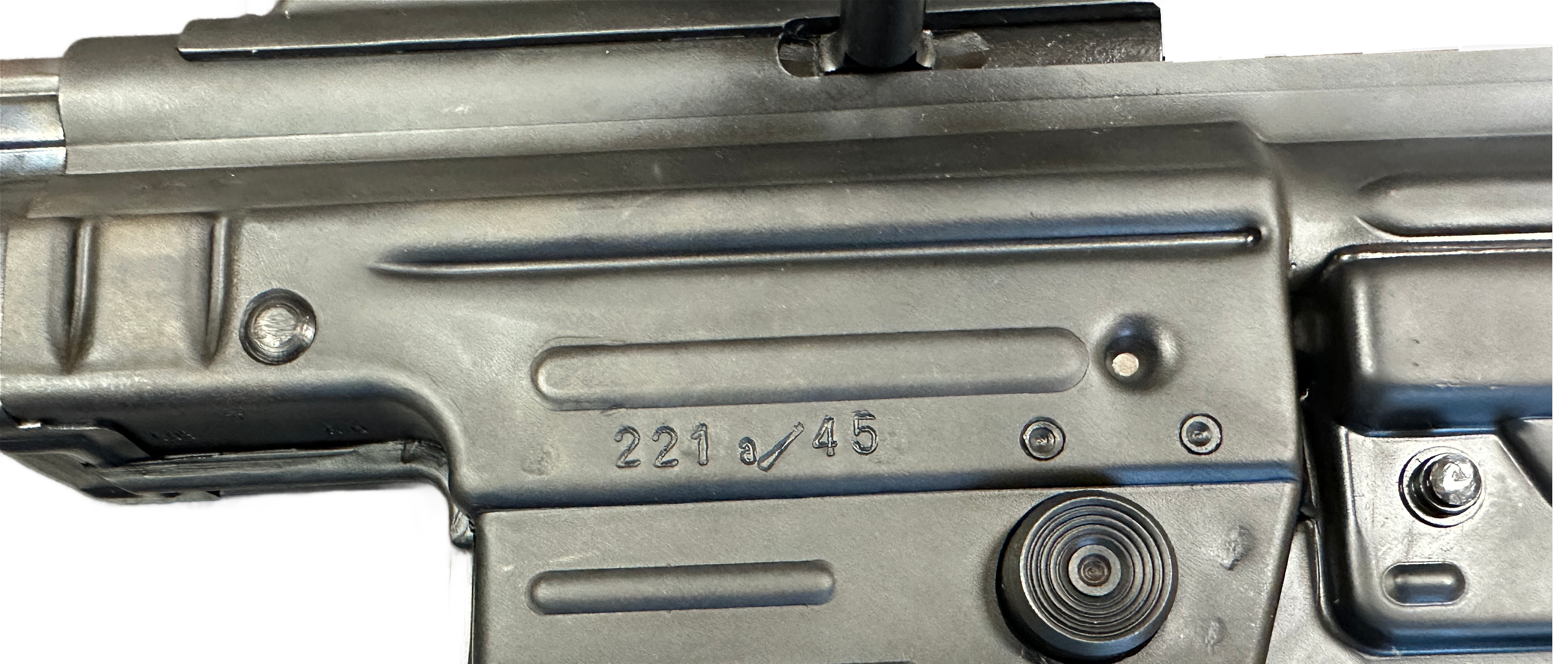 This Bert Dittrich Germany designed Sturmgewehr Semi-Automatic, fires 7.92×33 (8mm kurz) rounds, from a 30-round magazine. The german stampings are identical to the original German production Sturmgewehr Stg44 from World War II. It also has un-finish-machined forgings for parts like the stacking rod and gas block, correctly duplicating the original German production.