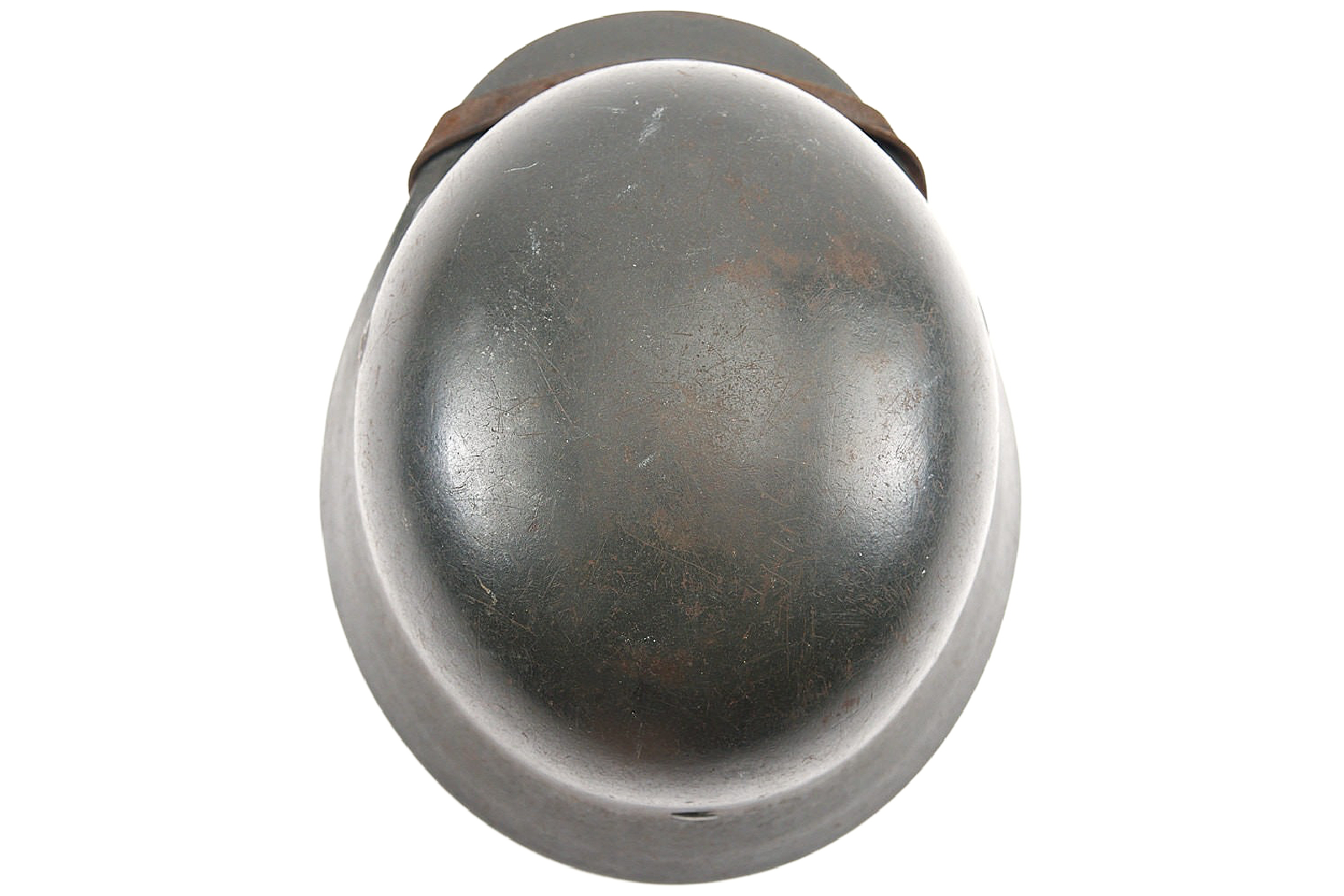 Inside, the helmet is fully complete with its original wartime steel liner band. The liner leather is well-preserved, showing honest use and only light aging. A name once written inside has been scratched out, suggesting it may have been issued to more than one soldier during its service. The drawstring is still intact, and the liner bales retain their original chinstrap, complete with aluminum buckle. The long strap end is maker-marked and dated 1940.