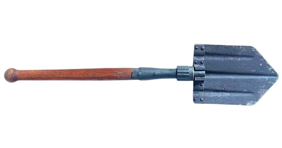 The design of the German folding shovel was relatively simple. It consisted of a metal blade attached to a wooden or metal handle that could be folded for compact storage and transportation. The blade was typically rectangular in shape, with a sharpened edge on one side for digging and cutting. The handle could be folded at a 90-degree angle, allowing the shovel to be used for digging or scraping, and then folded back for easier carrying.